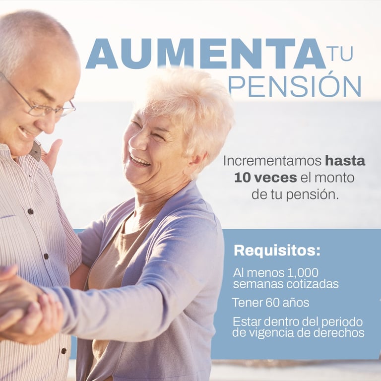 Crea un visual optimista con pareja bailando, destacando los requisitos para aumentar la pensión de forma atractiva.